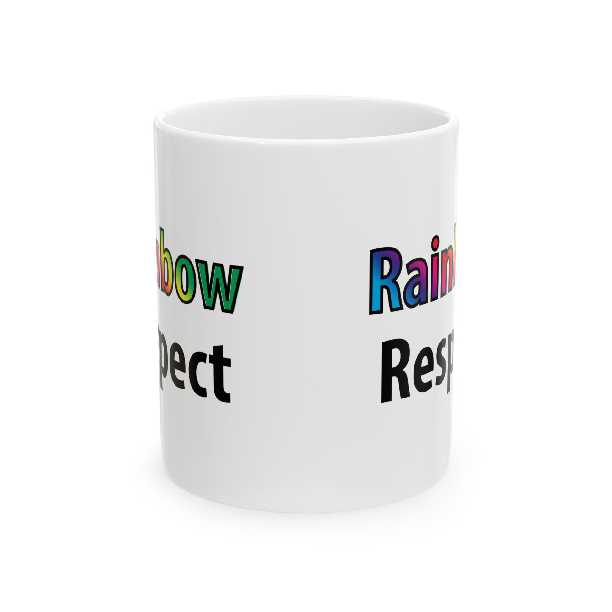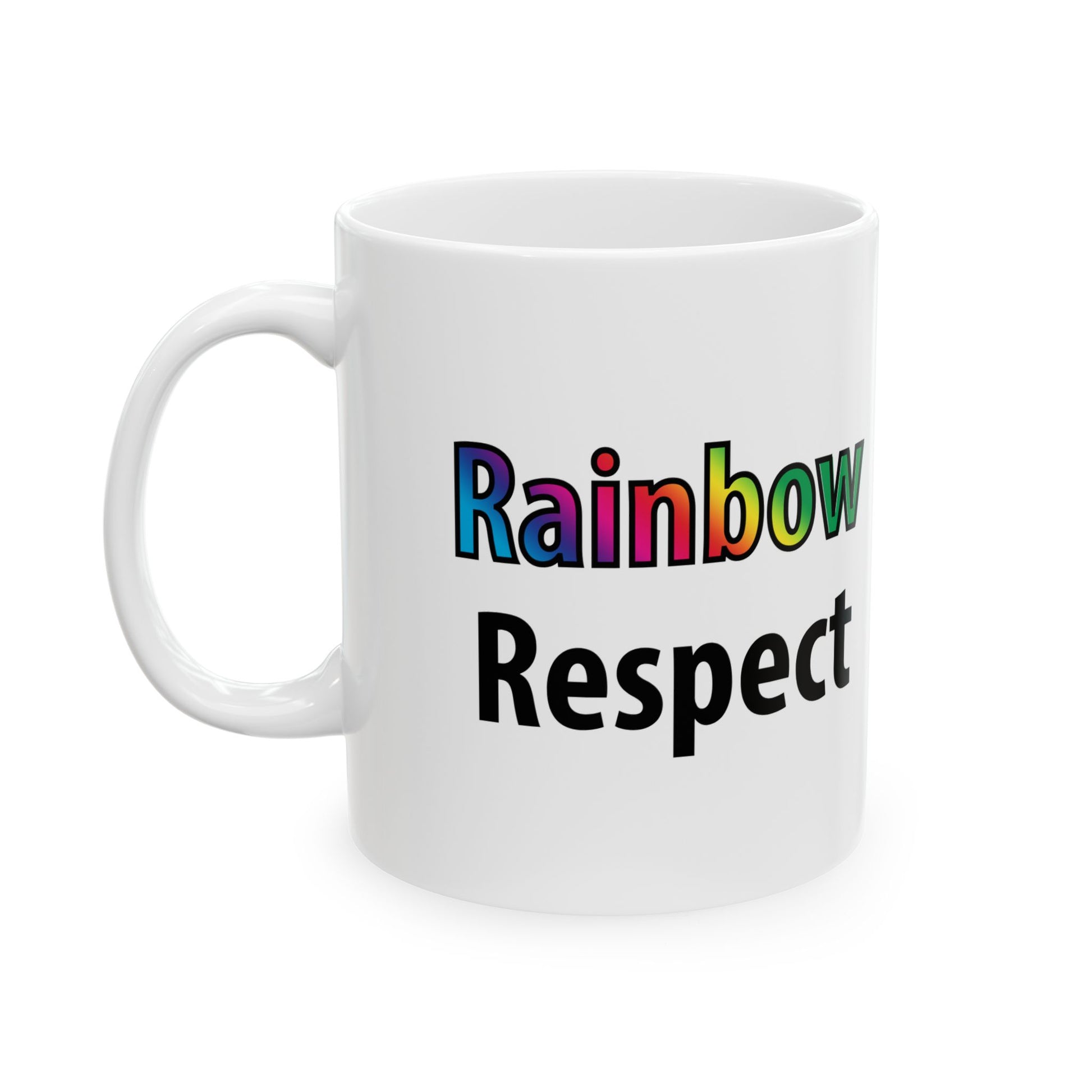 This ceramic mug features the phrase Rainbow Respect — a minimalist statement with maximum meaning. The word “Rainbow” shines in full spectrum color while “Respect” keeps it grounded. It’s the perfect blend of Pride and purpose for your morning routine, office desk, or as a thoughtful gift.
