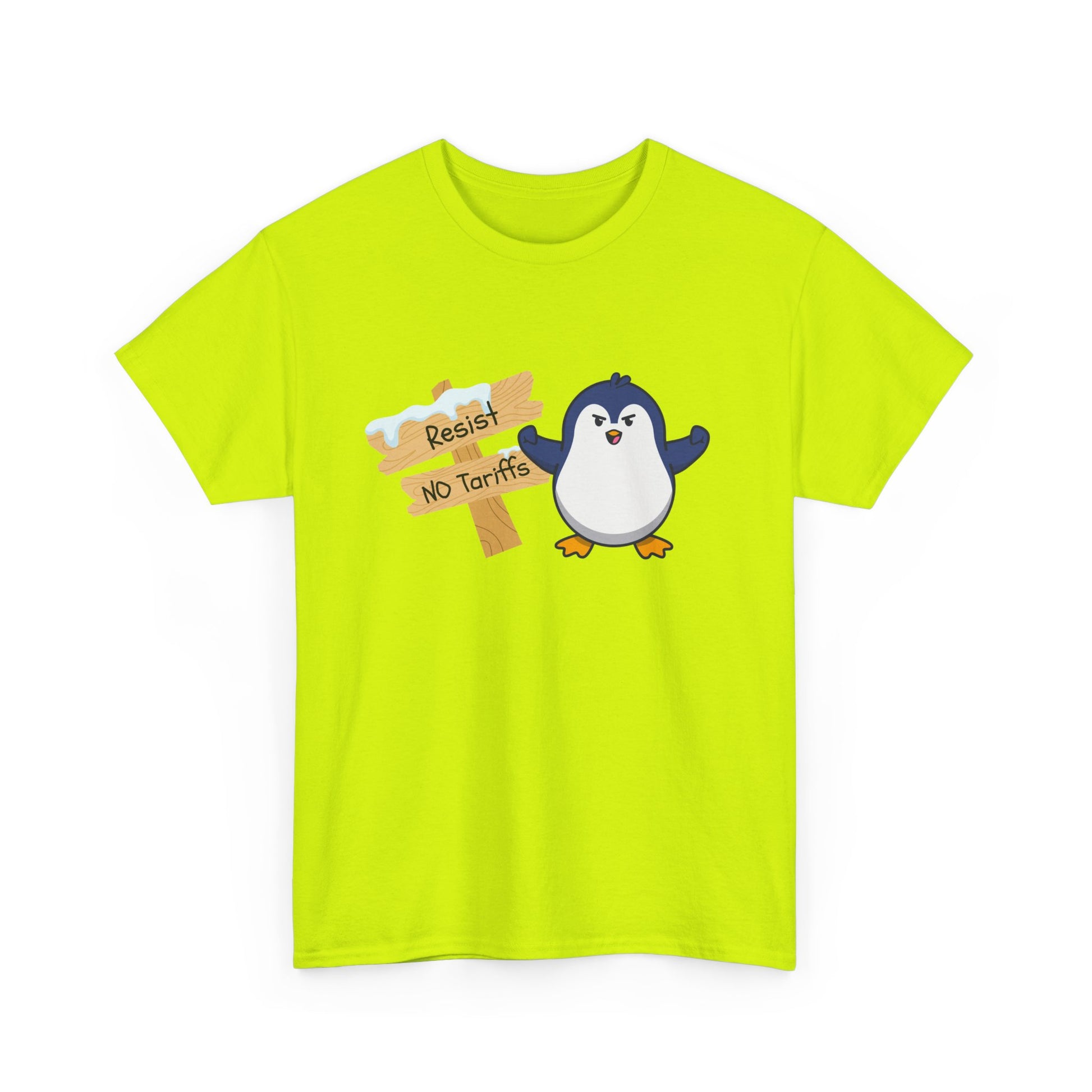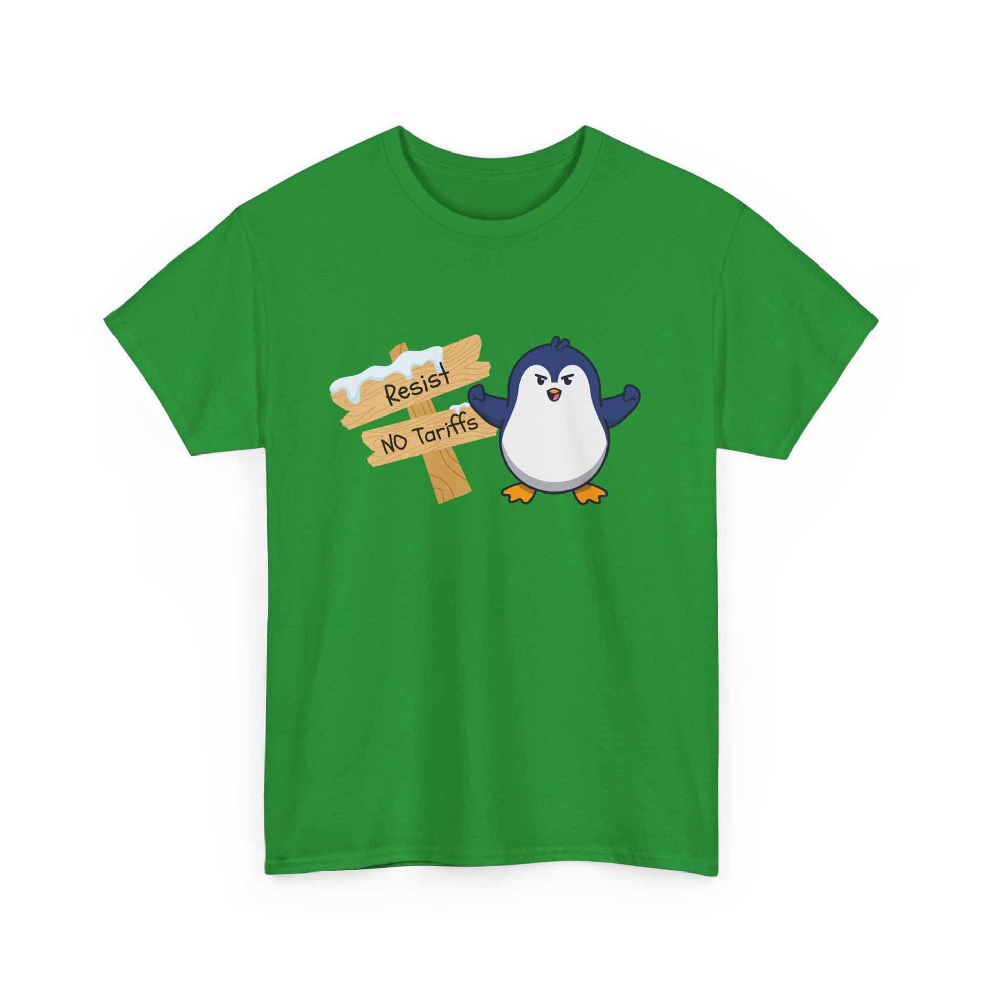 A unique tee featuring penguins protesting tariffs, perfect for those looking to make a statement with their clothing. This tee is ideal for adults who enjoy a comfortable fit and want to stand out with a bold design. Relevant for casual wear, protests, political events, and everyday statements.